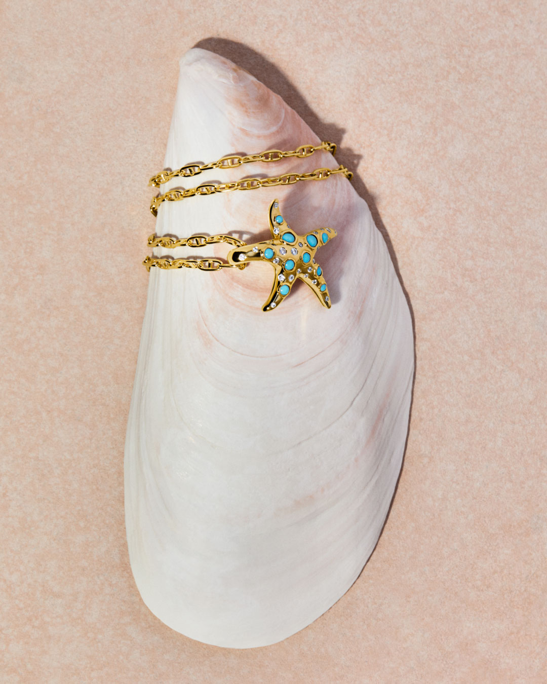Gleaming under the golden sun, the Starfish Collection captures the quiet poetry of the sea — a symbol of renewal, beauty, and resilience. The design reinterprets the starfish with a semi-organic silhouette, where soft asymmetry meets minimal refinement. Turquoise stones — reminiscent of tranquil ocean tides — are paired with clear cubic zirconia, each cradled in organically shaped bezels that echo the natural rhythm of water. Crafted in silver and gold plating, every piece balances fluidity with structure, evoking the effortless elegance of summer days. Elevated yet instinctive, the collection celebrates the harmony between nature’s imperfection and human craftsmanship.